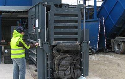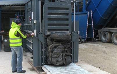 The model HSM HL 3521 T can be filled via conveyor and is especially designed to compact tyres. Of course, other packaging materials can also be compressed.